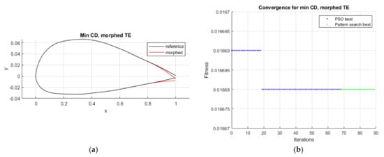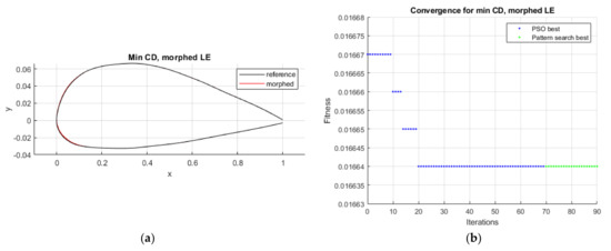 The aircraft optimization process has evolved dramatically over the past decades. The design of new intelligent algorithms and computational solvers has substantially impacted the overall design process, including the “morphing aircraft optimization”. The verification and validation of aircraft design using optimization techniques has reduced its huge experimental costs and has been achieved by the use of efficient algorithms and computational solvers [47,48]. An optimization process is initiated by minimizing or maximizing an objective function for the target design concept with respect to design variables subjected to given constraints, which were applied to limit the search space and therefore to yield physically feasible optimization results. Both gradient-based and gradient-free intelligent algorithms have been used in these optimization processes, and their results are dependent on the type of optimization problem to be solved [47]. These algorithms are discussed in the following sections. Many optimization techniques based on bioinspired processes and Surrogate-Assisted natural methods have been formulated, and mathematical and statistical analysis of these algorithms has been performed [49,50,51,52]. The comparative performance study based on convergence trends was performed with different geometry parameterization techniques. Both advantages and disadvantages can be found in these optimization algorithms for complex shape functions. However, the goal of this study is to perform aerodynamic design optimization of morphing airfoil using Particle Swarm Optimization (PSO) algorithm combined with Pattern Search technique.