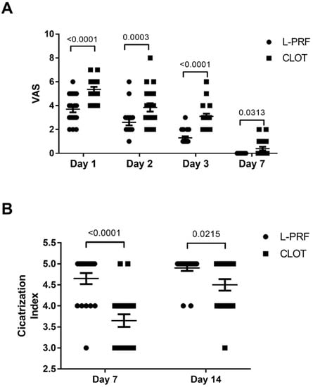 (A) Pain evaluation by Visual Analog Scale (VAS) for 1, 2, 3, and 7 days in the postoperative period. (B) Comparison of the soft tissue healing, as measured by the Landry´s index, at seven and 14 days of the postoperative period. Squares indicate the score for the clot site of each participant, while circles indicate the scores for the leukocyte-platelet-rich fibrin (L–PRF) sites. Lines indicate the mean ± SD. Connecting lines indicate statistical difference (p value indicated on the figure).