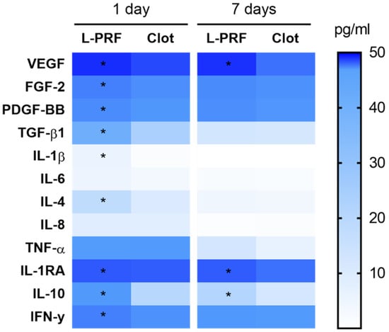 Heatmap of the cytokines extracted from swabs of the L–PRF and Clot sites at 1 and 7 days after surgery. The intensity of the blue color indicates the mean concentration (n = 20) of each analyte, as detected by flow luminometry. An asterisk indicates a significant difference between L–PRF and Clot at the same experimental time (p < 0.05).