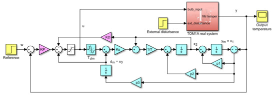 Experiments have shown that by compensating for at the ESO input, as suggested in [33], the performance of disturbance step responses improves, but worsens for setpoint step responses. For these, a more effective way to reduce the excessive input and output increments is to increase the value. This raises the question of whether it would not be better to compensate only part of the identified dead-time in ESO. In the next we will solve the given problem by including some time-constant delays as part of the identified dead-time. In this way, we also obtain additional state variables suitable for the use of higher-order controllers. 4.5. Evaluation of ADRC2