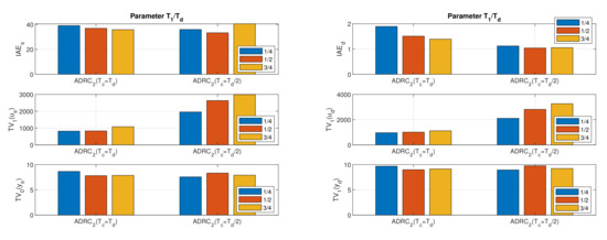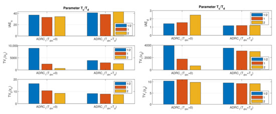 The comparison can be finished by concluding that the controllers with depend on the tuning parameter determining the speed of the disturbance observer less than controllers setting with also . This result can also be interpreted as an increased sensitivity (reduced robustness) of the first set of controllers at , signalized by increased shape deviations at the input and output. For the second set of controllers, the sensitivity is roughly uniform and without significant peaks.