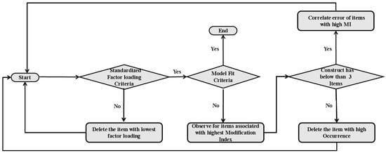 In addition to the fitness indices, the threshold for item factor loading must be satisfied. In this study, items with factor loadings below 0.50 or greater than 1.0, and those with a negative value, were deleted. If all items meet these criteria but the fitness index is not satisfied, items associated with highest modification index were sought [70,71]. It was possible to either delete one of the factor loadings, or constrain both factor loadings [72,73]. The deletion process was preferred to improve construct definition with respect to the high factor loadings and uncorrelated items [73]. If the items in one of the construct are consistently below the three items, the researcher can apply an alternative process, the constraint procedure [73,74]. Figure 2 summarizes the steps for evaluating the model fit in this study.