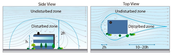 5]. These areas include buildings, trees, or mountains that are obstacles to the wind path, causing a decrease in wind speed and an increase in turbulence. The turbulence area reaches 2 or 3 times the height of the obstacles, while in the frontal contact part, it is 2 to 10 times [