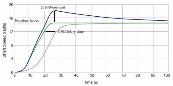 10]. To obtain a stable response of the mechanical pitch angle positioning system, a range of PID controller gain values is determined to ensure a maximum overshoot of 25% and a maximum delay time of 30%. The system response for each criterion from a unit step response with a nominal wind speed value is shown in