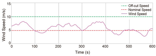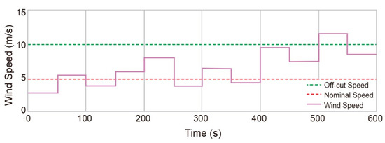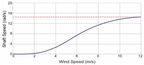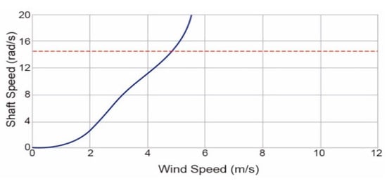 Figure 4. It is observed that the wind turbine begins to rotate with a wind speed of 1 m/s, so the cut-in wind speed is set. In addition, a nominal rotation speed on the generator shaft of 14.6 rad/s is achieved with a wind speed of 4.9 m/s; therefore, it is the nominal wind speed.