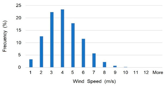 Figure 6 shows a histogram with the relative frequencies for each unit of magnitude of wind speed.