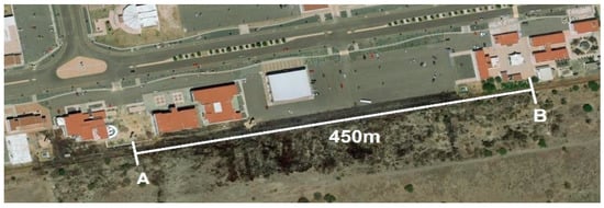 31]. In A, the generator is installed, and in B, it is proposed to install the anemometer 450 m apart, both places located within the university.
