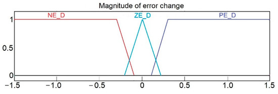 The error values and the magnitude of the error change were adjusted by means of experimental adjustment. Three linguistic levels are assigned for each variable, negative (NS_E), zero (ZS_E), and positive (PS_E) for the error; and negative (NE_D), zero (ZE_D) and positive (PE_D) for the magnitude of the change in the error value.