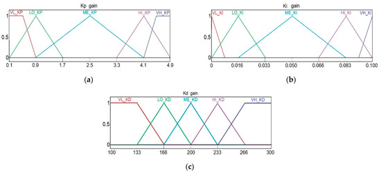 The values assigned to the membership functions for the output variables are obtained within the range of pre-set PID gains for optimal controller response. Each of the gains has five linguistic levels: Very low (VL_KP), low (LO_KP), medium (ME_KP), high (HI_KP), and very high (PB_KP) for
