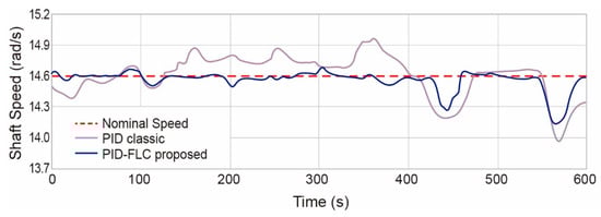 Figure 17. It is observed that with the PID-FLC controller, rotation speed peaks are generated when abrupt changes in wind speed occur. This is good and indicates that when the increase in wind speed occurs, the generator shaft accelerates, but quickly returns to the nominal speed; this is because the positioning of the pitch angle is done faster or earlier than the wind reaching the rotor, depending on if it was by an increase in wind speed or by a wind gust. In the classic PID controller, when the wind speed increase occurs, the peaks do not occur, because the rotation speed of the generator shaft decreases slowly. This is because the pitch angle positioning is done after the wind caused an acceleration in the turbine.
