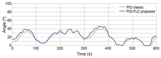 Figure 18 documents the pitch angle movement. When the PID-FLC controller detects a change in wind speed, with the anemometer at 450 m distance, the pitch angle movement starts early, while the PID controller starts moving seconds later, until the wind speeds up the turbine. It is also observed that with the proposed PID-FLC, the pitch angle displacements are of greater magnitude, so the speed of the generator shaft remains at nominal speed values, while with the classic PID controller, the pitch angle displacement increases, only as the error in generator shaft speed increases.
