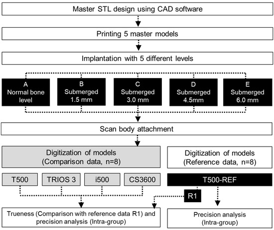 An ISB (implant scan body) was connected to each master model and scanned. The exposed length of the ISB varied with the implant level.