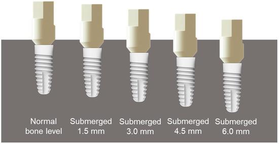 A maxillary model (Dentiform, Nissin Dental Products, Kyoto, Japan) was scanned using a tabletop scanner (T500, Medit, Seoul, Korea), and the created study model was exported as files in Standard Tessellation Language (STL) format. The STL was imported into dental CAD software (Exocad DentalCAD, Exocad, Darmstadt, Germany). The lateral incisor, first premolar, and first molar of the model were removed to create a modified model in the form of an edentulous ridge. Five maxillary master models were printed using a 3D printer (Form 2, Formlabs, Somerville, MA, USA) and light-cured resin (standard gray resin, Formlabs). Screw-typed bone-level implants (10 mm long and diameter of 4.1 mm; Straumann, Basel, Switzerland) were placed where teeth were removed at different levels: Normal bone level, submerged 1.5 mm, submerged 3.0 mm, submerged 4.5 mm, and submerged 6.0 mm. The direction of the internal antirotation structure of the fixture was unified to keep the direction of the ISB the same as that of the implant in the buccal direction (Figure 2 and Figure 3).