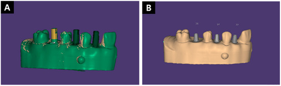 The first computer-aided design (CAD)/computer-aided manufacturing technology was introduced in the early 1980s, and the use of optical scanning equipment has become very widespread in recent years. Digital impressions and restorations can be made by using an intraoral scanner to digitally acquire images of teeth and surrounding tissues directly in the oral cavity, thereby replacing existing impressions (alginic acid, polyvinyl siloxane, or polyether) and eliminating errors that may occur when using other methods [16,17]. Consequently, fabrication of various types of implant prosthesis using a digital method has become common [18,19,20]. In the workflow of manufacturing an implant prosthesis, it became possible to acquire digital data and fabricate a prosthesis by capturing an implant scan body (ISB) connected to the implant fixture, surrounding teeth, and soft tissue in three dimensions using an intraoral scanner [21,22]. The ISB is attached to the implant fixture placed in the oral cavity, and when it is scanned together with the surrounding structures, information such as the implant placement position and orientation that is not visible from the outside can be stored as a digital impression [23]. After loading the obtained digital impression into CAD software, the virtual ISB library stored in the software is matched with the previously scanned ISB to store the location. Small inaccuracies may occur during this process [24]. In particular, a low scan quality of the ISB may result in inaccuracies occurring during the registration process of the library of the ISB, producing errors in the implant fixture position of the virtual model [24,25].
