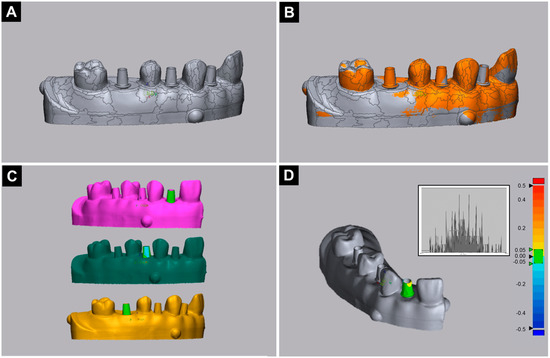 The process of analyzing the position of the replaced implant abutment in three dimensions: (A) After loading the reference data, the abutment regions were divided using an auto segmentation tool; (B) Alignment of the reference data and comparison data in an optimal position using a best-fit algorithm; (C) The process of analyzing the three different positions of the abutment in three dimensions; (D) Displaying the 3D analysis results as a color map.