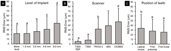 One-way ANOVA was performed to evaluate the trueness according to changes in the exposed length of the ISB, scanner type, and tooth position (Table S1, Figure 7). The RMS value tended to be low in all of the implanted groups when the implant was installed at the normal bone level. The T500 scanner showed the lowest variance in all groups, and the highest trueness. For this scanner, when the implant was submerged 6.0 mm at the positions of the lateral incisor, first premolar, and first molar, the RMS values increased significantly to 108.0 ± 26.1 µm, 74.4 ± 17.0 µm, and 75.5 ± 30.9 µm, respectively, indicating decreased trueness. In the case of the TRIOS 3 scanner, when the implant was submerged 4.5 mm at the positions of the lateral incisor and first molar, the RMS values increased significantly to 53.4 ± 6.9 µm and 35.9 ± 17.5 µm, respectively. For a submersion of 6.0 mm, the RMS values at the lateral incisor, first premolar, and first molar increased rapidly to 125.8 ± 5.4 µm, 117.2 ± 6.8 µm, and 125.6 ± 2.9 µm, respectively, indicating decreased trueness. In the case of the i500 scanner, the RMS value increased significantly to 43.1 ± 12.0 µm when the implant was submerged 3.0 mm at the position of the lateral incisor. At the positions of the first premolar and first molar, when the ISB was submerged 4.5 mm, the RMS values were significantly higher at 71.3 ± 8.3 µm and 57.8 ± 10.1 µm, respectively. For a submersion of 6.0 mm, the RMS values at the positions of the lateral incisor, first premolar, and first molar were 122.5 ± 4.1 µm, 112.5 ± 14.0 µm, and 118.4 ± 8.7 µm, respectively, indicating sharp increases in the deviation. For the CS3600 scanner, the deviation increased significantly to 93.6 ± 15.0 µm when the implant was submerged 4.5 mm at the position of the lateral incisor. For a submersion of 6.0 mm, the RMS values at the positions of the lateral incisor, first premolar, and first molar were significantly higher, at 107.0 ± 20.4 µm, 65.5 ± 37.9 µm, and 77.3 ± 35.6 µm, respectively.