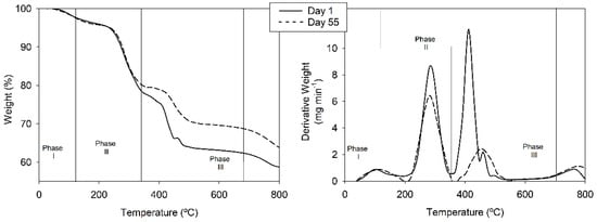 Different researchers [18,19,20,21,22,23,24] exposed three main phases in the thermal degradation of compost: (i) the first phase is between an initial and final temperature of 25 and 120 °C; (ii) the second phase is between 200 °C and 350 °C; (iii) the third phase is between 350 °C and 700 °C (Figure 1).