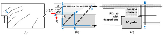 To analyze and improve the shear behavior of the dapped end of the PC slab, a strut–tie model was proposed in the existing literature [31] (Figure 2b). In the strut–tie model of the dapped end, the dotted line and solid line indicate the compressive force and tensile force, respectively, and the value on the line represents the magnitude of the load acting on the element. According to the strut–tie model, to prevent a diagonal tensile failure at the corner of the bent portion by the reaction force R, a tensile-resistant member that has the same force magnitude as the reaction force R should be placed at the BC element in Figure 2b. Therefore, in the design of the dapped end, shear reinforcing bars are generally placed to resist the tensile force loaded on the BC element (Figure 2c).