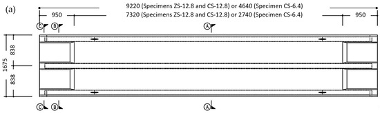 Figure 4 shows the dimensions and reinforcement details of the test specimens. The slab length was 9220 mm for Specimens ZS-12.8 and CS-12.8 and 4640 mm for Specimen CS-6.4 (Figure 4a). The dimensions of the section of the PC slab specimen prior to the placement of the CIP concrete are shown in Figure 4b. The section had three webs, with EPS installed between the webs. Two prestressed strands of ϕ15.2 wire were installed at the bottom of each web (i.e., six strands of wire). A D16 non-prestressed reinforcing bar was additionally placed at the outermost layer of each web (i.e., 3-D16 bars in three webs). Wire mesh was placed at the top flange (Figure 4b), and 6-D16 flexural reinforcement was placed at the bottoms of the dapped ends. Horizontal reinforcement was also placed to prevent cracking.