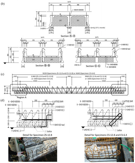 Currently, to improve the vulnerable structure of the dapped end, due to the unanchored shear reinforcement at the construction stage, Z-shaped shear-reinforcing bars are placed inside the PC slab (Figure 3a). However, the Z-shaped shear reinforcement is not anchored in the flexural rebars. Therefore, in place of the Z-shaped shear reinforcement, clip-type shear reinforcement (Figure 3b) was proposed. The clip-type shear reinforcement, as a closed type, was arranged in the direction of the tensile stress generated at the dapped end for an optimal design to improve the anchorage performance. The structural efficiency of the diagonal and continuous shear reinforcement can be found in the existing literature [32,33,34].