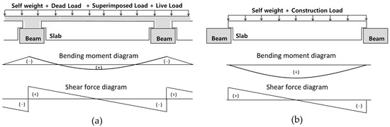 Figure 5 shows the loading and supporting conditions of the PC slabs under a service load (Figure 5a) and a construction load (Figure 5b). At the service stage after structure completion, the PC slab was integrated with a beam formed by the CIP topping concrete. Thus, the PC slab was subjected to positive and negative bending moments at the center and slab ends, respectively (Figure 5a). On the other hand, at the construction stage before the CIP topping concrete placement, the PC slab was simply supported on the beam under its self weight and the construction load with a positive bending moment (Figure 5b). In this study, to investigate the structural performance of the proposed system at the construction stage, simply supported PC slabs, prior to the CIP concrete placement, were tested (Figure 5b).