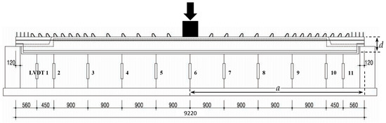Figure 6 shows the test setup simulating an actual construction stage in practice. The specimens were simply supported by steel zigs at both ends. Monotonic loading was applied at the center of the PC slab using the displacement control method. Strain gauges were attached to the wire strands and reinforcing bars to evaluate the strains of the flexural reinforcement and the contributions of the shear reinforcement. Linear variable differential transformers (LVDTs) were placed at the bottoms of the specimens to measure deflection (Figure 6). To prevent potential damage to the LVDTs underneath the slab in case the specimen collapsed, the test was paused at a certain high loading, and the LVDTs were carefully removed, except for the LVDT measuring the central deflection. Then, the test was continued with the single LVDT at the center.