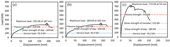 In Figure 7, the predicted strengths of each specimen are shown. For Specimens ZS-12.8 and CS-12.8, if the anchorage performance of the dapped end’s shear reinforcement was insufficient, the predicted strength would decrease, owing to a shear failure at the dapped end, as indicated by the green dashed line. On the other hand, if shear failure was prevented at the dapped end, a flexural failure would be expected, as shown by the red, long dashed line in Figure 7a,b. Because Specimens ZS-12.8 and CS-12.8 ultimately failed in flexure at the center (Figure 7a,b and Figure 8a,b), the tested to predicted strength ratios were 1.22 and 1.20, respectively (Table 2 (13)). This indicates that, by using Z-type or clip-type reinforcement, the flexural strengths of the PC slabs at the construction stage could be predicted with an adequate safety margin.