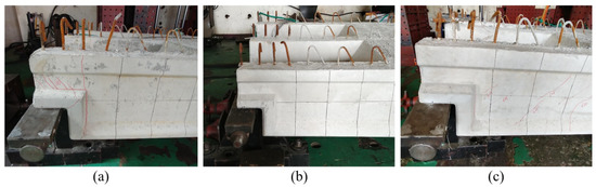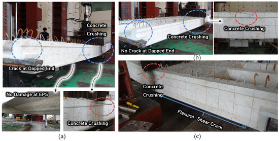 However, technical issues should be addressed when applying this new construction method. In general, the dapped end can be severely stressed when the concentrated load is applied, and the cross-sectional shape changes rapidly. Thus, shear failure may occur at the dapped end, as shown in Figure 2a [31]. Special care should be taken to design the dapped end by providing appropriate shear reinforcement [29] when it is introduced in a multi-tee PC slab.