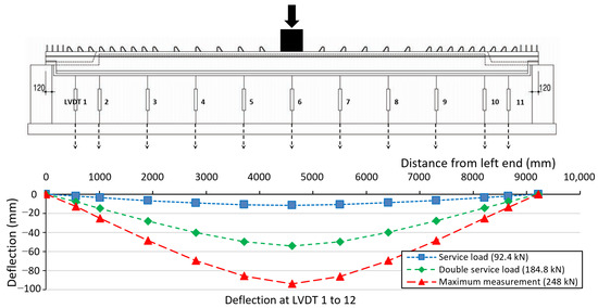 Figure 9 shows the displacement distributions measured by the LVDTs for ZS-12.8 for the service load, double the service load, and the load corresponding to the removal of the LVDTs. Under the service load, the specimen showed elastic deformations due to the noncracking concrete (Figure 7a and Figure 9), which indicates that the structural safety of the PC slab system was secure under the construction load. Under double the service load considering a potential higher load, owing to the flexural cracking at the center of the PC slabs, the central displacement was increased by the decreased stiffness, resulting in a larger curvature at the center. This behavior was more significant under the maximum measurement (248 kN).