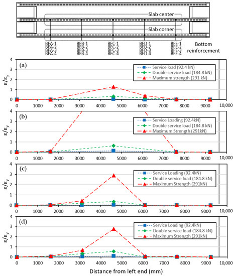 Flexural strain of ZS-12.8 under the following loadings: (a) strand at the slab’s center; (b) rebar at the slab’s center; (c) strand at the slab’s corner; and (d) rebar at the slab’s corner.