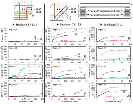 Figure 12 shows the strain distributions of the unanchored shear reinforcement (S1–S4) and shear reinforcement (Z1 or C1–C2), placed at the dapped end for each region (A–D) of each specimen. The horizontal axis indicates the central displacement of the PC slabs, and the vertical axis indicates the measured strains of the shear reinforcement. In ZS-12.8, the strains for the Z-type shear reinforcement (Z1) were very limited and were close to those of the unanchored shear reinforcement (S1–S4), except for those of Region (C), where the strains of the shear reinforcements were much greater than those of other regions (i.e., Regions (A), (C), and (D)). Owing to the limited anchorage performance of Z-type and unanchored shear reinforcement, the damage was likely to concentrate only on a support without stress distribution to the other supports. Furthermore, in Region (C), the strain of the Z-type shear reinforcement (Z1) was not significantly greater than the unanchored shear reinforcement (S1–S4). This result indicates that the Z-type shear reinforcement demonstrated poor anchorage performance and ineffective load transferring at the dapped end because it was not properly anchored into the concrete without enclosing flexural reinforcement.