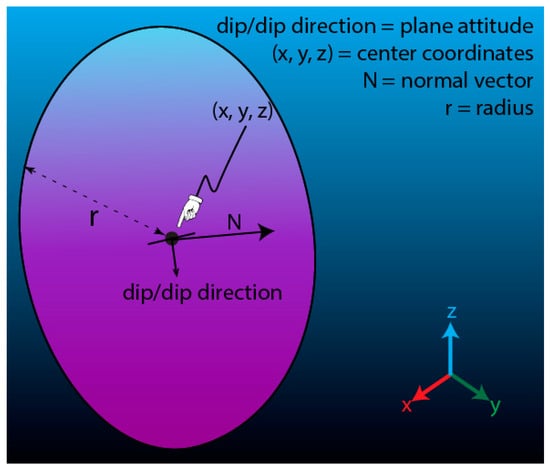ROKA has been developed considering three main basic assumptions. The first and principal assumption is that the discontinuities’ surface is considered planar and circular, following the Baecher’s disc model [33]. This assumption is widely used in material mechanics [34,35,36,37], and it considers discontinuities as discs; therefore, a discontinuity can be described by the coordinates of the disc center (cx, cy, cz), disc radius (r), and orientation of the 3D plane in which the disc lies (Figure 2). The orientation of the disc can be defined by its attitude (e.g., dip/dip direction) or by its normal N.