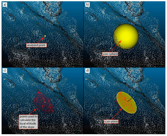 Figure 3. Example of the calculation influenced by the scan-radius. (a) For each point of the 3D point cloud, (b) a moving scan-sphere, with a scan-radius defined by the operator, (c) selects all the points used to calculate the local orientation of the slope. (d) A circular scan-plane, centered onto the analyzed point and oriented as the local portion of the slope (previously calculated using the scan-sphere), is defined. It will be used to verify if the discontinuity planes or intersections intersect the surface of the slope.
