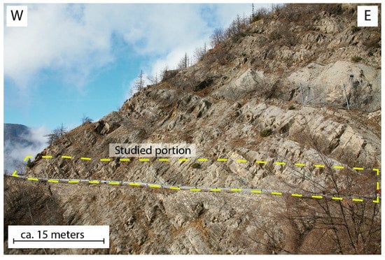 Recently, different authors showed that new remote sensing techniques permit overcoming the limits of the traditional field survey-based and direct-contact sampling approaches (e.g., [18,19,20,21,22,23]). This is possible thanks to the possibility of acquiring data from inaccessible portions of the outcrops and making analysis using the so-called Digital/Virtual Outcrop Model (DOM/VOM). DOMs can be developed using the Digital Photogrammetry (DP), which is a low-cost and user-friendly methodology [24,25] that has been recently widely applied in geosciences [25,26,27,28,29,30,31,32].