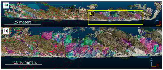 • Exportation of the results (potentially unstable discontinuities and portions of the rock slope) and their visualization in the open-source software Cloud Compare (Section 2.5); Cloud Compare is a 3D rendering environment where the 3D point cloud and meshes representing the rock slope can be visualized, and “virtual” discontinuity surfaces or traces can be measured [23].
