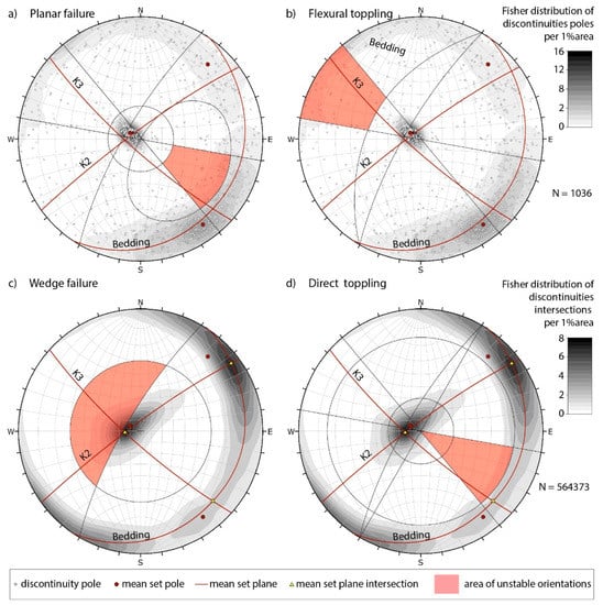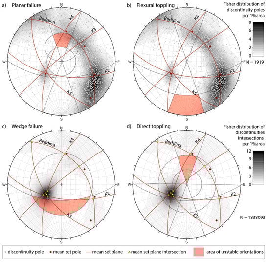The Kinematic Analysis (KA) is certainly the simplest and quickest technique because it is purely geometric. It evaluates the possible MOFs, analyzing the angular relationships between slope surface and discontinuities [1] without considering the forces responsible for the MOF [2]. In any case, before carrying out more sophisticated analyses by numerical methods, it is often useful to proceed with an evaluation of the potential mechanisms of kinematic instability affecting a slope. Several studies have been realized to determine the possible MOFs using stereographic projection-based techniques [3,4,5,6,7,8,9,10]. Among them, the Markland test [4] and its refinement proposed by Hocking [6] is one of the most used methods.