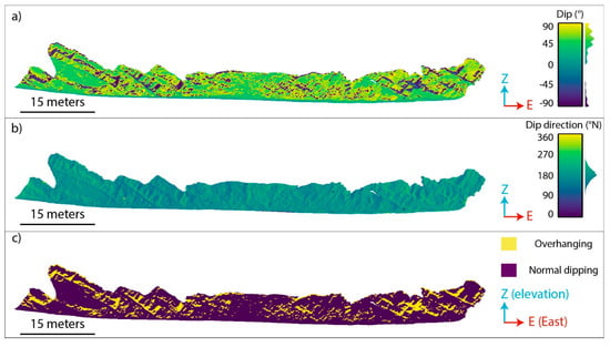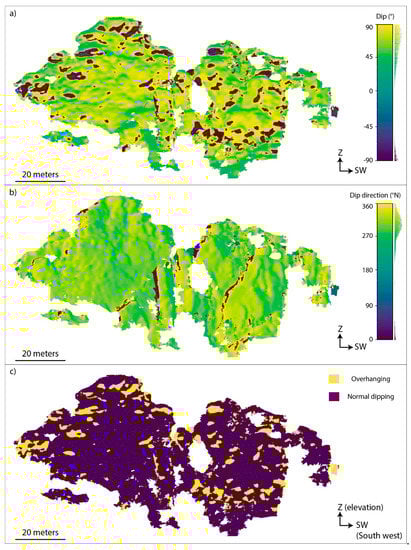 Figure 17. (a) Dip and (b) dip direction of the local orientations of the 3D model of the slope calculated from the normal vectors of the points that fall inside the moving scan-sphere of a radius of 1 m. In (c), the areas in yellow represent portions of the slope that have an overhanging attitude.