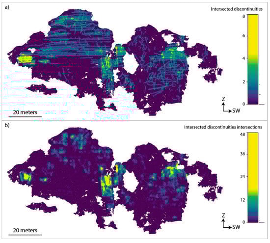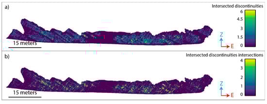 Figure 18. Rendering of the 3D model of the slope indicating (a) the number of the intersections between the scan-plane and discontinuities for every point of the cloud where the scan-plane (representing the local geometry of the slope) is centered and (b) the number of the intersections between the scan-plane and the discontinuity intersections.