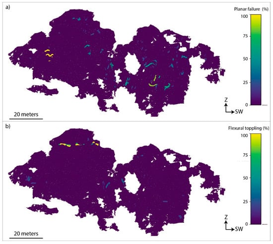 Figure 19. Rendering of the 3D model indicating the results of the ROKA Kinematic Analysis of the possible modes of failure. The color scale represents the critical value of the discontinuity planes that could activate (a) planar failure and (b) flexural toppling (see Section 2.5 for the critical value definition).
