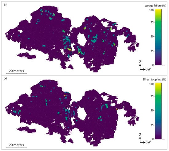 Figure 20. Rendering of the 3D model indicating the results of the ROKA Kinematic Analysis of the possible modes of failure. The color scale represents the critical value of discontinuity intersections that could activate (a) wedge failure and (b) direct toppling, (see Section 2.5 for the critical value definition).