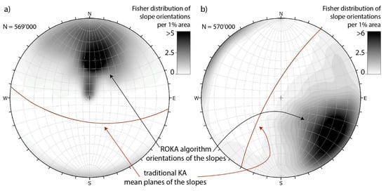 The second main advantage of the ROKA method is the more accurate determination of the different local slope orientations using a movable scan-sphere, the radius of which can be defined by the operator. On the contrary, the traditional KA generally considers only one orientation, i.e., the slope’s mean orientation (Figure 21).