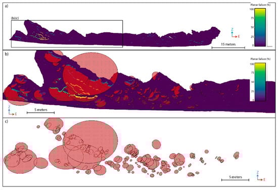 Figure 23. (a) The ROKA algorithm allows the visualization and identification of the critical discontinuities for each MOF directly onto the 3D model of the rock slope—the box identifies the sector presented in figures b and c—and (b,c) to filter discontinuities considering their critical value based on the dimension of the intersection between the slope and the discontinuity.