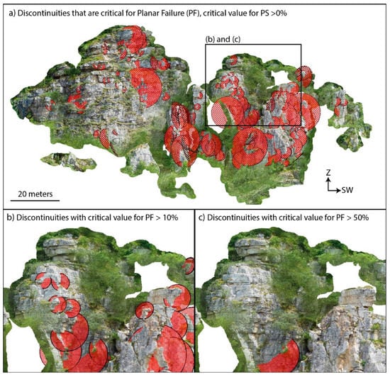 The principal advantage of DOM-based rock slope stability analysis is the possibility of performing digital measurements, mapping all the visible discontinuities of the rock, and extracting their information, such as position, orientation, and size, with high precision and accuracy. The knowledge of the exact orientation and dimension of the measured discontinuities, but, in particular, of their location onto the rock slope, allows an easier verification if each discontinuity is critical for the portion of the slope where it outcrops.