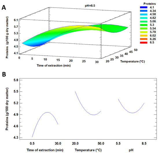 The protein and carbohydrate values for each extraction condition are shown in Table 2. As can be seen in the table, the protein values ranged from 4.14 to 6.10 g/100 g of dry matter, being the optimal conditions for the maximal protein recovery (24.4 min, 20 °C and pH 8.5) obtained under this condition: 5.96 g of proteins/100 g dry matter. On the other hand, the values for the carbohydrates ranged from 1.39 g/100 g dry matter to 2.52 g/100 g dry matter. In this case, the optimal conditions for the highest carbohydrate extraction were 30 min, 50 °C and a pH of 8.5, obtaining 2.53 g of carbohydrates/100 g dry matter.