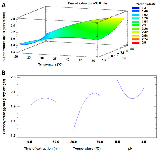 The influence of the extraction time, temperature and pH for the proteins and carbohydrates is shown in Figure 1 and Figure 2, respectively. Regarding the protein, as can be seen in Figure 1, although it seems that both the temperature and time affected protein extraction, the ANOVA analysis revealed that these changes were not significant (p = 0.0553 for temperature and 0.1690 for the time of extraction). The pH did not show any significant influence (p = 0.6355). On the contrary, regarding the carbohydrate extraction, the temperature clearly influenced the extraction (p = 0.0040), while the pH and time of extraction did not have a significant influence (p = 0.2954 and 0.6061, respectively). Regarding the temperature, as can be seen in Figure 2, an important increase in carbohydrate extraction was found, obtaining the maximum yield at temperatures between 45–50 °C. This fact can be explained due to the modification of the integrity of the cell wall after the increase in temperature, then the solvent solution contact with the intracellular compounds was facilitated, thus improving their extraction [27].