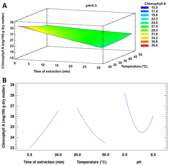 Regarding pigment extraction, the chlorophyll A values ranged from 17.99 to 37.95 mg/100 g dry matter, and the carotenoid values were quite smaller, ranging from 0 to 4.93 mg/100 g dry matter (Table 3). The optimal conditions for the highest extraction of chlorophyll A were 0.5 min, 20 °C and a pH of 5.5, obtaining a theoretical value of 36.28 mg/100 g dry matter. The optimal conditions for carotenoid recovery were 30 min, 20 °C and a pH of 8.5, reaching a theoretical value of 4.87 mg/100 g dry matter. As can be observed in the table, the theoretical optimal values were really close to those obtained experimentally with the same conditions (36.28 vs. 35.56 for chlorophyll A and 4.87 vs. 4.93 mg/100 g dry matter for the carotenoids).