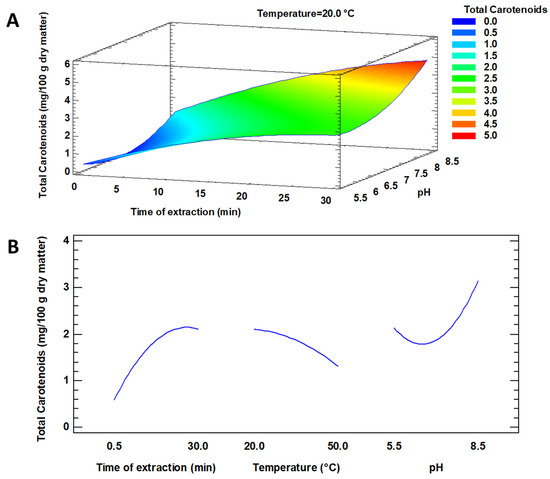 For the carotenoids, the extraction time had a strong influence (p = 0.0192), although the temperature and pH did not have a significant effect (p = 0.1493 and 0.0815, respectively). The extraction time clearly improved carotenoid extraction, while the temperature had a slight impact, decreasing carotenoid recovery. Additionally, at pH = 7, the carotenoid extraction was at its minimum, while the maximum value was obtained at a pH level of 8.5 (Figure 4). Gilbert-López et al. [30], who optimized the microwave and pressurized liquid extraction of carotenoids from P. tricornutum, also described a reduction in carotenoid extraction when the temperatura increased, probably due to compound degradation.