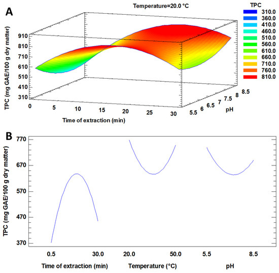 Regarding the TPC, the most influential parameter in their extraction was the time (p = 0.0496). The efficiency of the extraction increased with the passage of time (up to 16 min) when the TPC value was at its maximum. After 16 min, this value decreased (Figure 5). This is in close agreement with the results reported by Parniakov et al. [17] for Nannochloropsis spp., who found that the optimal extraction of the total phenolic compounds assisted by ultrasound (W= 400 W) was achieved after 15 min. Martínez-Sanz et al. [31] also found a huge increase in the TPC extraction from Nannochloropsis gaditana, Scenedesmus almeriensis and Spirulina platensis after ultrasound treatment for 5 min. The temperature and pH did not significantly influence the polyphenol extraction (p = 0.5568 and 0.2021, respectively). Other authors, such as Yucetepe et al. [32], also reported that neither the temperature nor the pH had a significant influence on the UAE of TPC from Spirulina platensis.