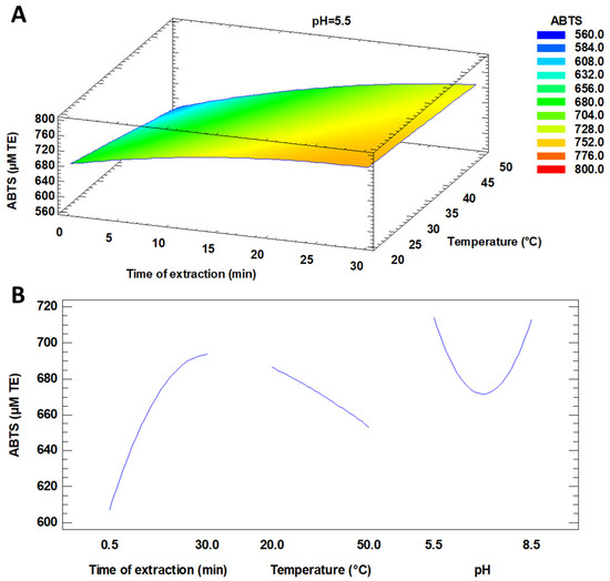 As can be seen in Figure 6, the antioxidant activity measured by the ABTS assay was strongly influenced by the extraction time (p = 0.0044), but the temperature (p = 0.1386) and pH (p = 0.9547) did not show a great impact. The increase of the extraction time led to a clear improved antioxidant capacity, from 698.57 µM at 0.5 min to 760.11 µM at 30 min (at the optimal conditions for the temperature and pH, 20 °C and 5.5, respectively). This can be explained by the increase in the antioxidant compounds´ extraction with the passage of time. Akyıl et al. [34] also found a significant influence of the extraction time on the antioxidant activity, measured by DPPH, when they optimized the bioactive compound extraction from P. tricornutum. However, Kokkali et al. [15] found a minimal decrease in antioxidant activity, measured by ABTS in P. tricornutum aqueous extracts, comparing 4 h and 24 h of extraction. The differences with our study can be explained regarding the huge time interval. For instance, in the present study, a time range was established from 0.5 min up to 30 min, while in the study conducted by Kokkali et al. [15], the time range was from 4 h to 24 h.