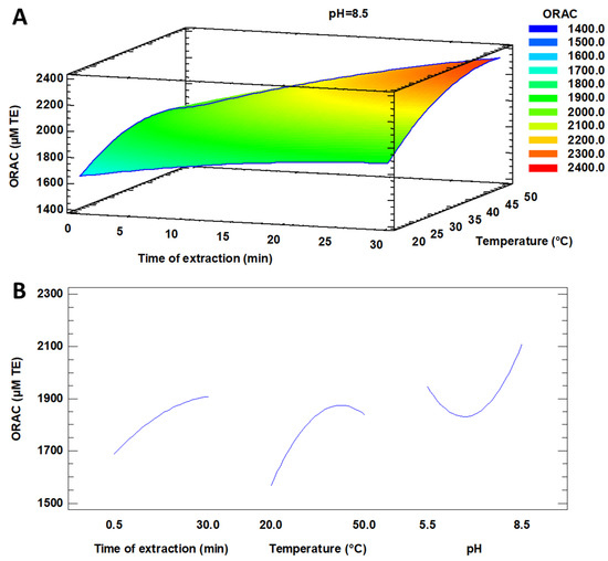 On the other hand, the extraction time also significantly influenced (p = 0.0364) the the antioxidant activity, measured by the ORAC method. Moreover, the temperature also affected the ORAC value even stronger (p = 0.0167) than the extraction time (Figure 7). Concerning the extraction time, it can be seen that at 20 °C and pH = 8.5, the antioxidant activity was 1766.48 µM TE at 0.5 min. However, when the time increased up to 30 min, the antioxidant activity was augmented (1842.10 µM TE). Furthermore, increasing the temperature also resulted in an improvement of the antioxidant activity. In our study, at pH = 8.5 and after 30 min of extraction (optimal conditions), the antioxidant activity measured by the ORAC assay was enhanced from 1842.10 µM TE at 20 °C up to 2340.01 µM TE at 50 °C. As can be seen, the ORAC values increased with the increasing temperature and extraction time, despite the fact that all the possible antioxidant compounds studied in the present work decreased under these conditions. This may be due to the presence of other compounds not identified in this study that may have had an impact on the antioxidant capacity measured by the ORAC method. It has been seen that the ORAC assay had a higher affinity for lipophilic compounds. Therefore, it could be that with these conditions, the amount of antioxidant lipid compounds extracted increased, contributing to the enhanced antioxidant capacity values measured by the ORAC assay [33].